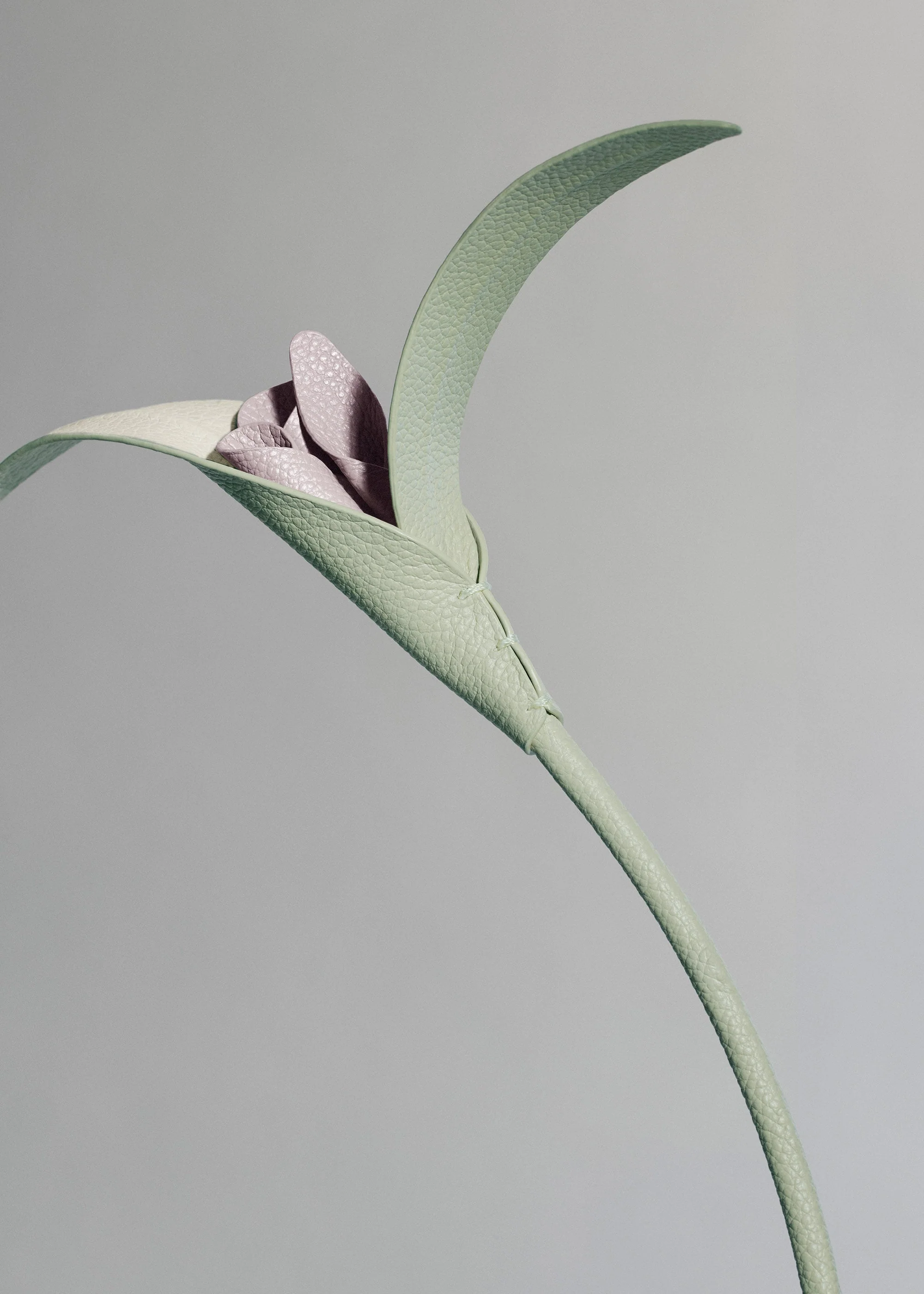 From the Plèi collection and made entirely from upcycled leather offcuts, the “Touka” flower is fashioned in three different hues of a single color. Its clean lines were inspired by the bird of paradise. Two asymmetric flowers have curled inner petals. Hand-stitched ribbed leaves subtly conceal the point where their leather-covered stems meet. This flower can be displayed in a bud vase, with other leather flowers, or in a bouquet of dried flowers. The name “Touka” is a play on the word “toucan”, echoing the bird of paradise flower which served as the inspiration for this piece.
